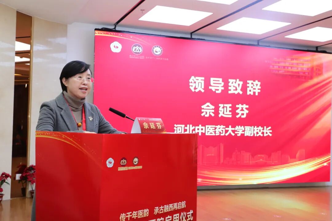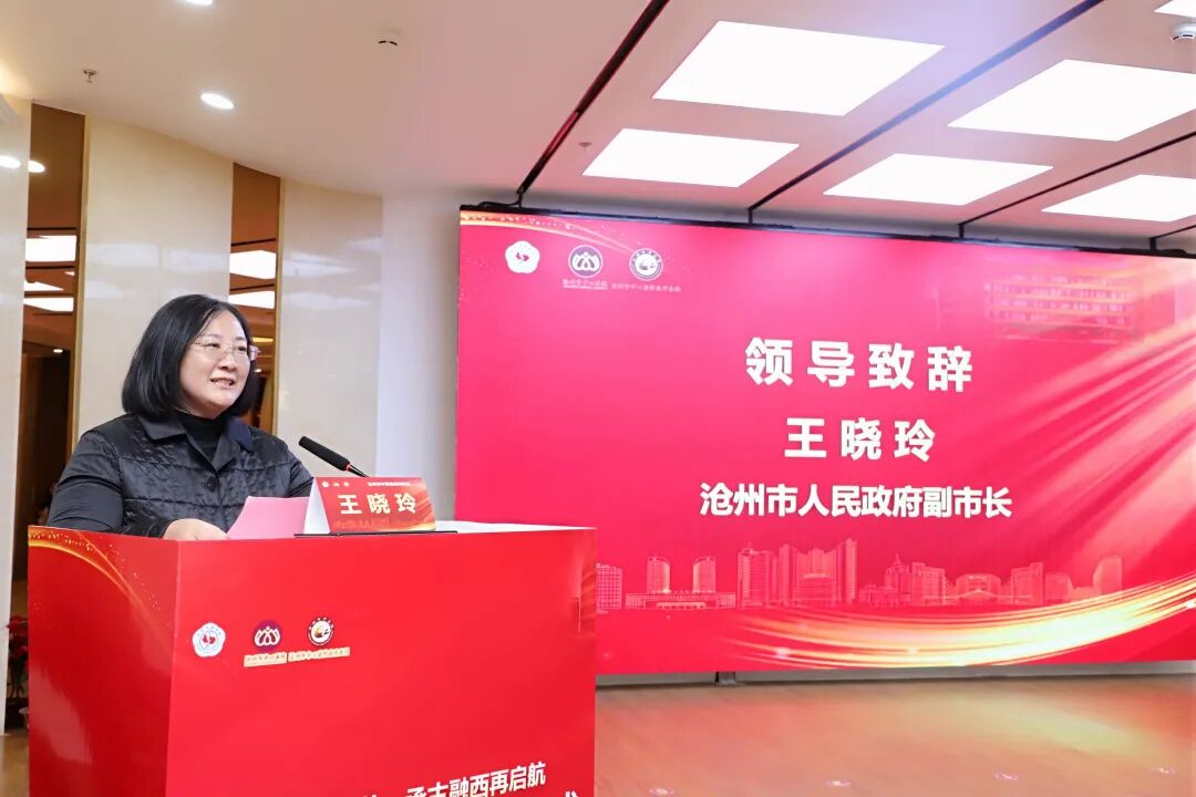 河北中医药大学副校长佘延芬致辞,河北中医药大学作为我省中医药教育科研服务的重要阵地,始终秉持着开放协作的理念,期待与沧州市中医院建立紧密合作关系,发挥学校教学师资优势,支持医院发展,共建高水平实践教学基地,共育新时代中医药人才;聚焦常见病与中医药的优势病种,联合开展课题研究,深化临床协作,推动成果转化,共同提升区域中医药服务能力,更好惠及沧州百姓。